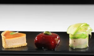 - Détailler les cannellonis, déposer sur un côté plat le crémeux et dresser la salade dessus en mettant du volume et terminer avec quelque shiso pourpre.