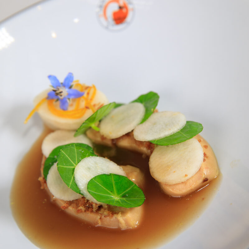 EntréeRecettes pour les professionnels Foie gras caramélisé au miso et vanille, consommé de canard à l’Hibiscus – Recette de Killian Rosini