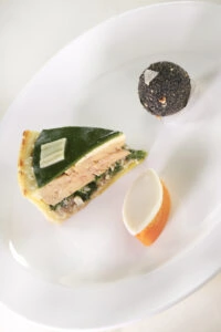 - Couler l’appareil parmesan en moules sphériques, ajouter les noisettes et les dés de foie gras puis bloquer au grand frais.